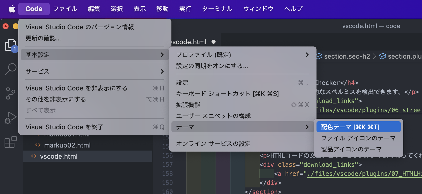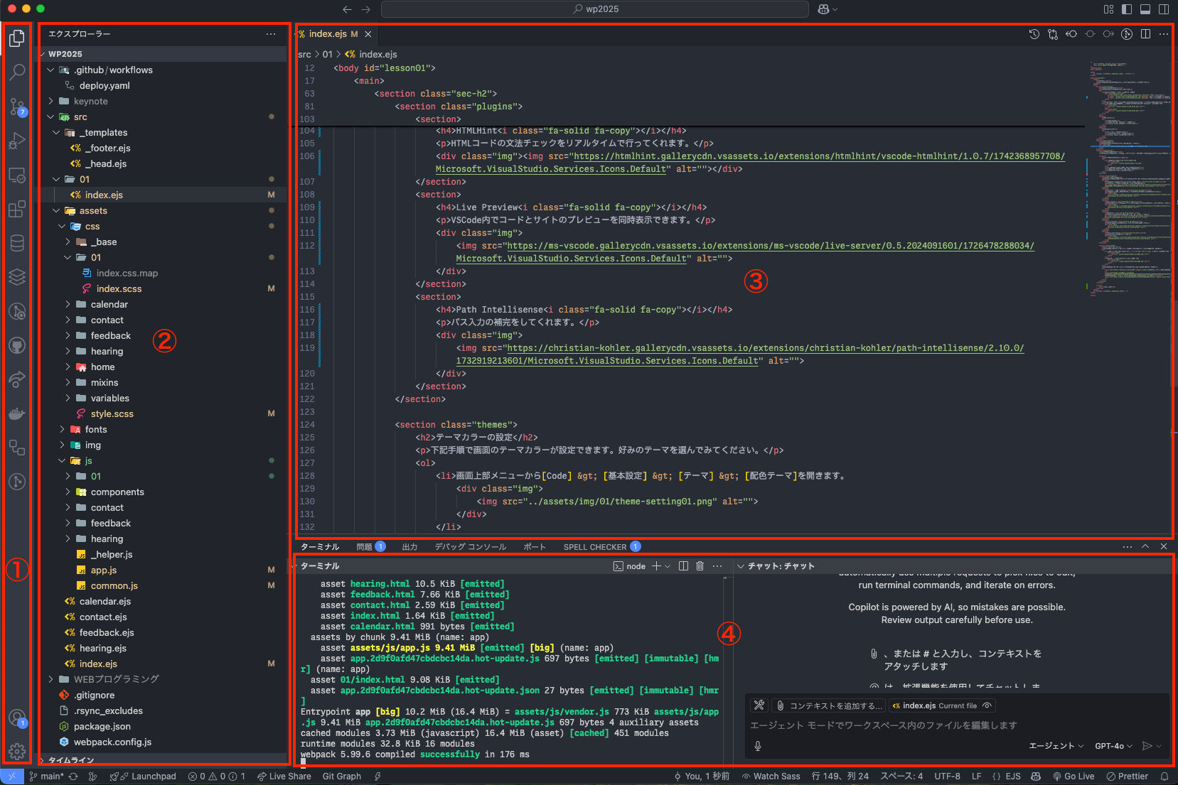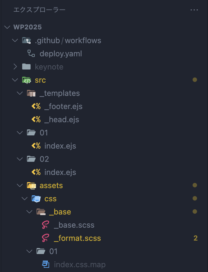 - アクティビティバーの横にあるのが(プライマリ)サイドバーです。主に作業中のプロジェクトファイルの一覧を表示します。