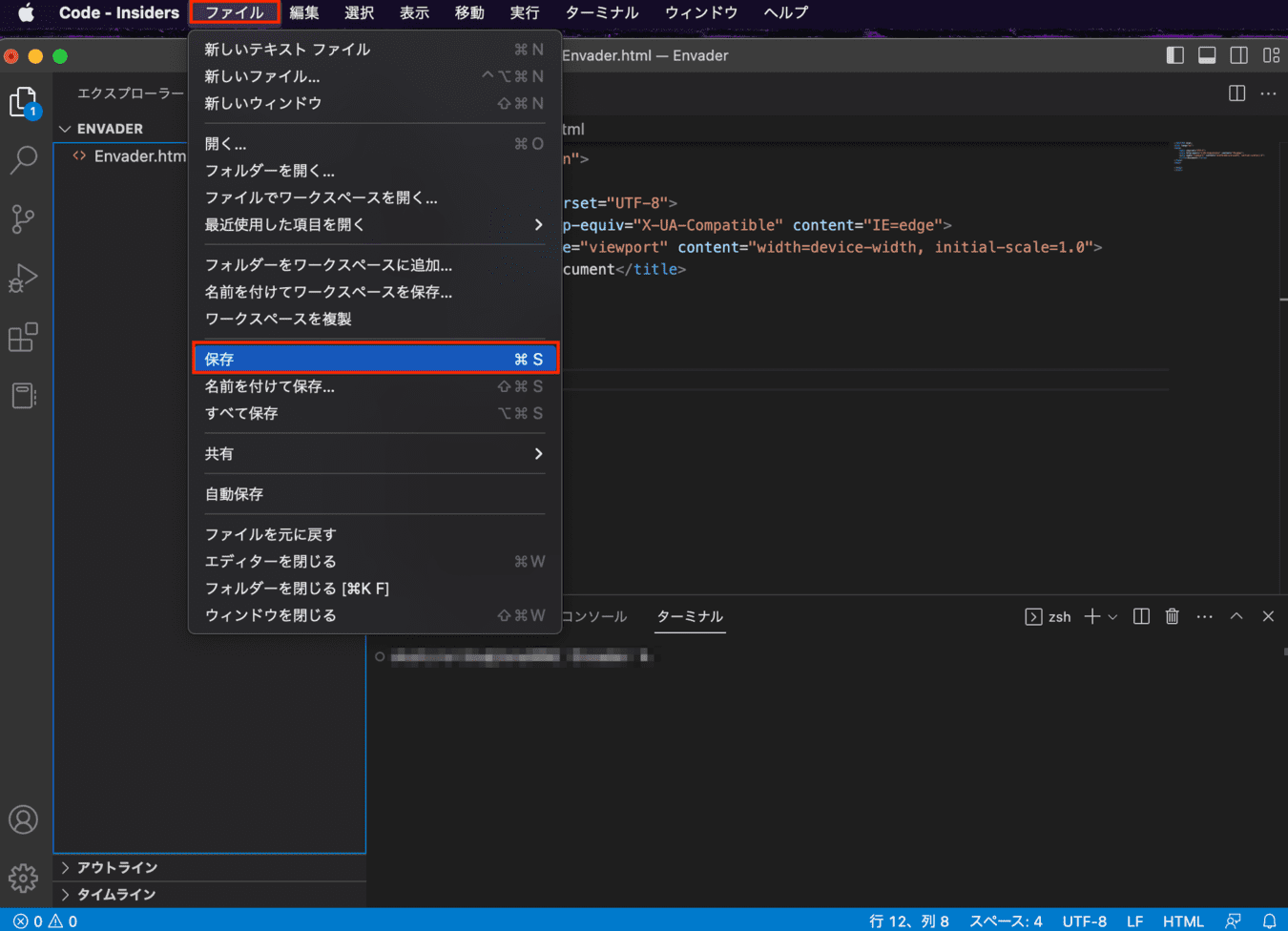 Prettierをインストールした場合、コードを整形することができます。下記操作で整形を実行できます。