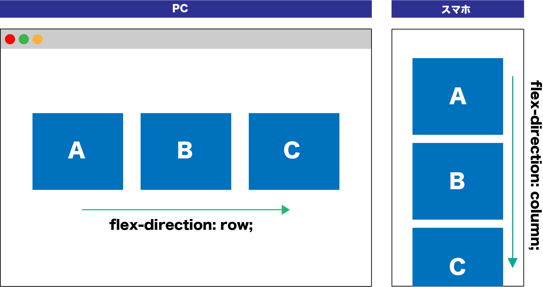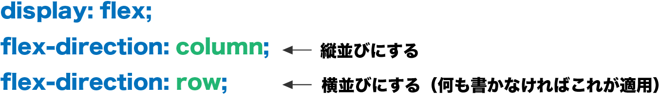 PCでは横並び、スマホでは縦並びにする方法です。display: flexとあわせて、flex-directionプロパティを指定します。