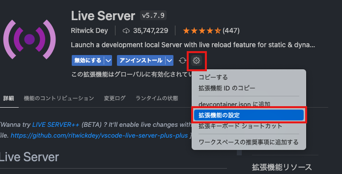 - VSCode左側のアイコンメニューから【拡張機能】を選択して【Live Server】を開く