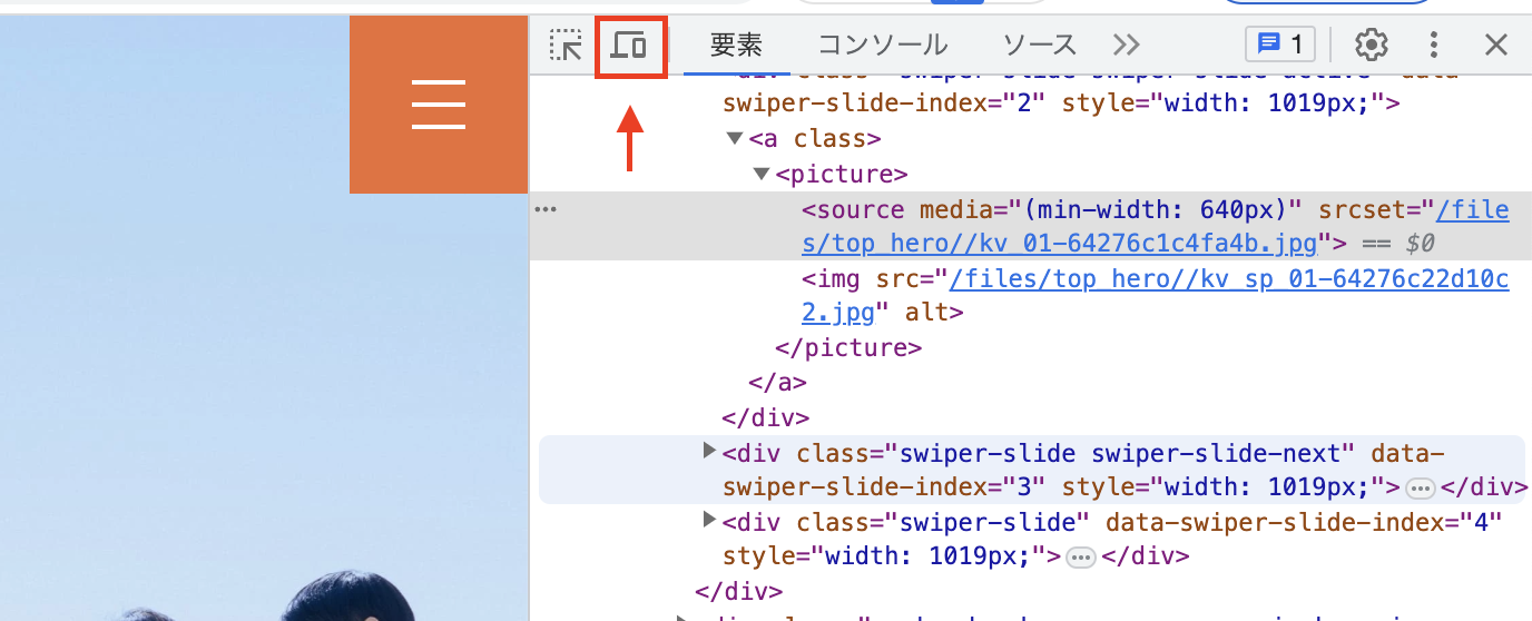 - 表示されたデベロッパーツール上部のアイコンをクリック