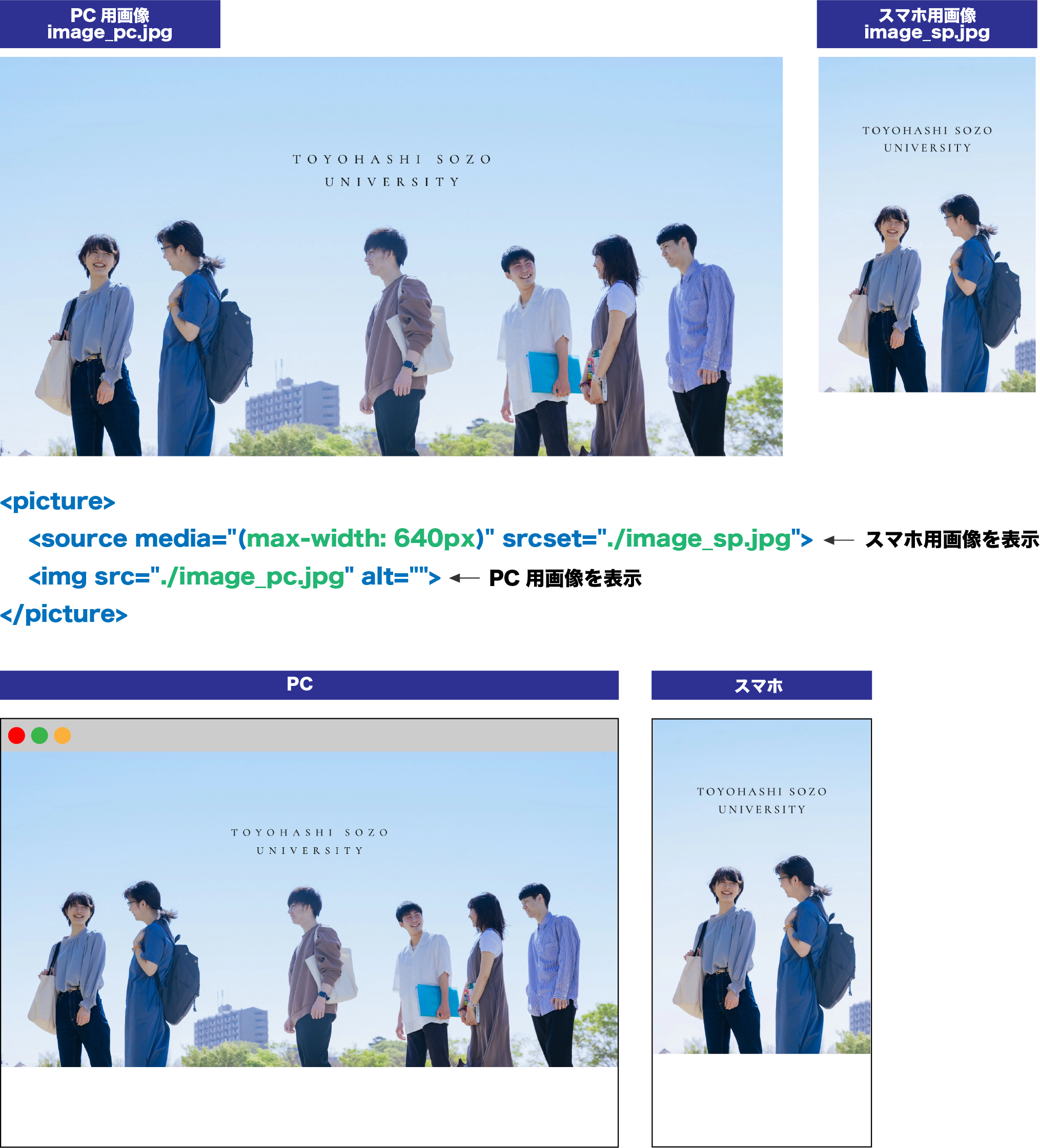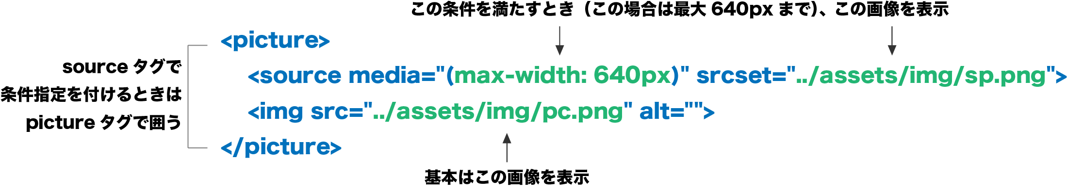 pictureタグとsourceタグで表示する画像の切替ができます。