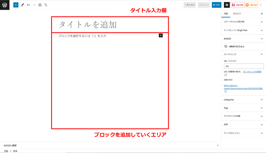 「タイトル入力欄」の下が、ブロックを追加していくエリアになります。