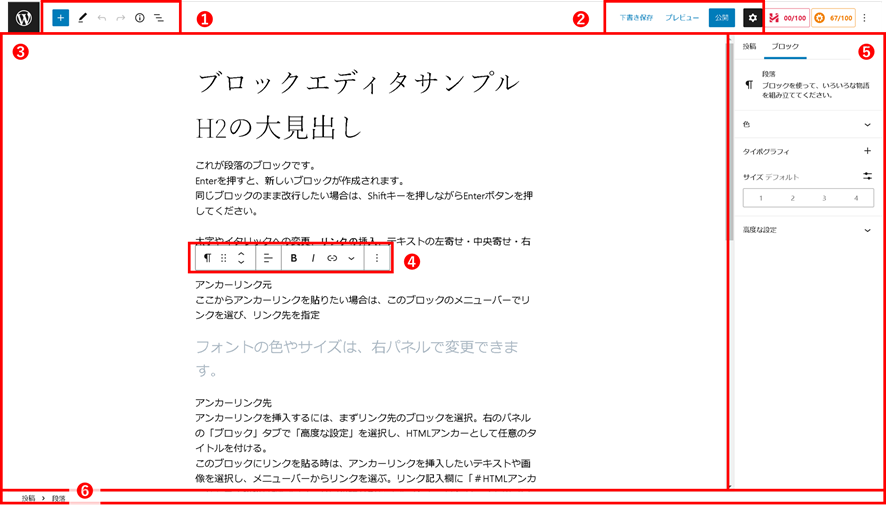 ブロックエディタ画面は基本的に以下のように構成されています。