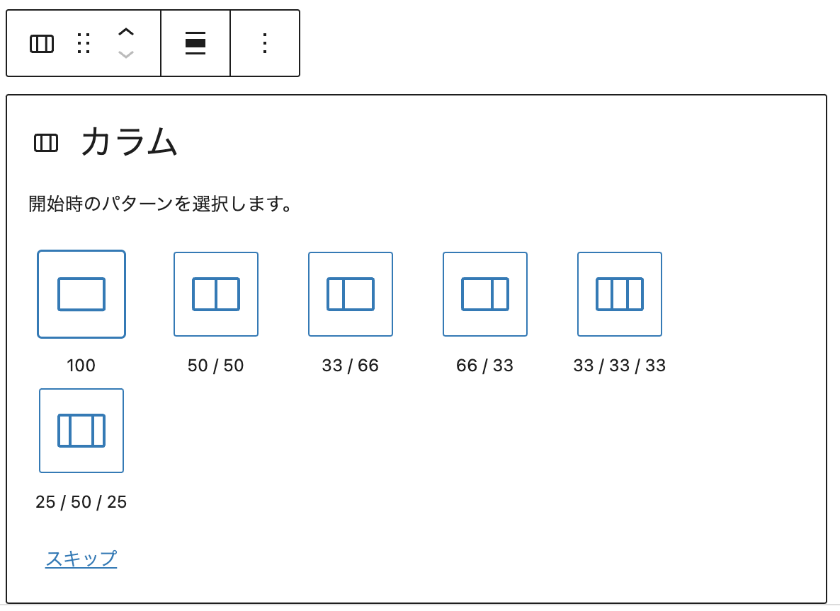 なおこのブロックの選択アイコンは初期状態では表示されていないため、「全てを表示」から一覧を表示するか、検索窓にて【カラム】を入力して表示させることで選択できます。