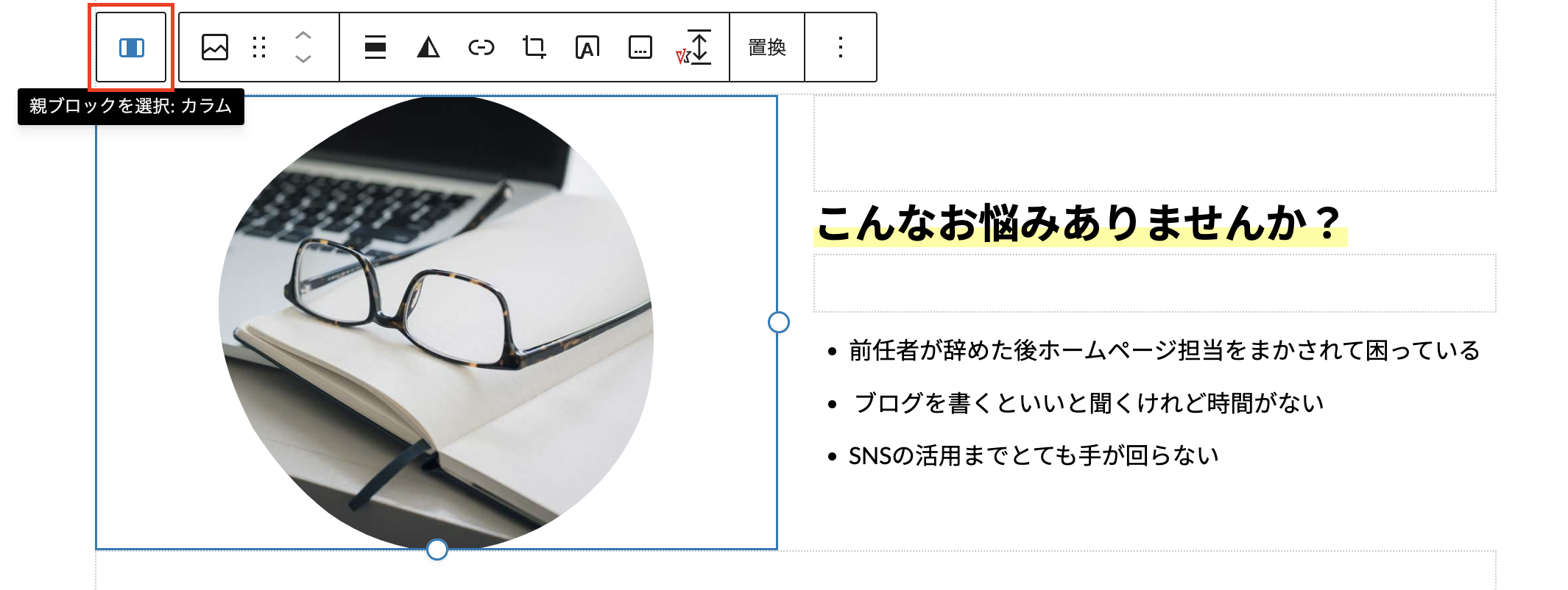 そのような場合は、子ブロックを選択した状態でメニューの一番左の【親ブロックを選択】ボタンをクリックする1階層上のブロックが選択可能になります。