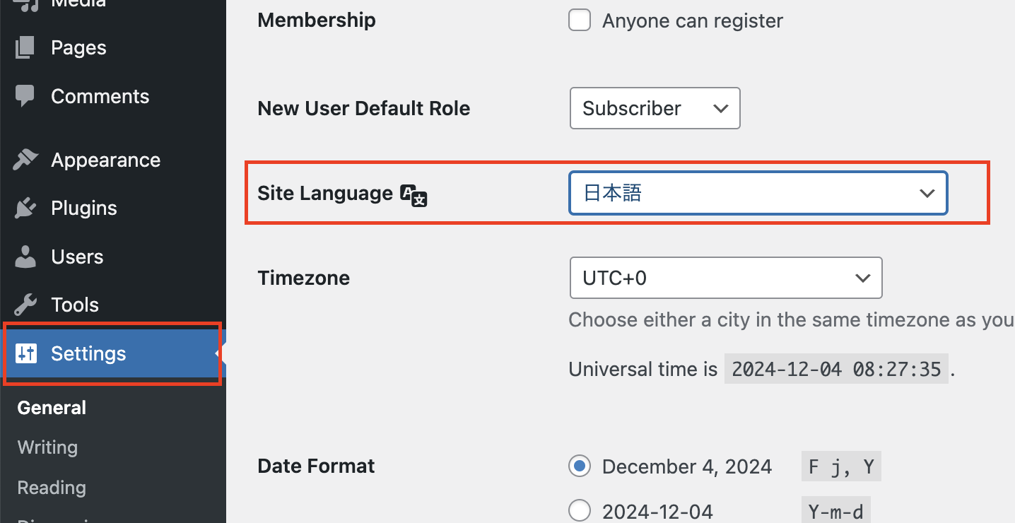 左側メニューの[Settings]をクリックし、Site languageの項目で【日本語】を選択します。