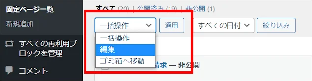 対象ページにチェックを入れたら、ページ下部の「一括操作」から「編集」を選択し適用をクリックします。
