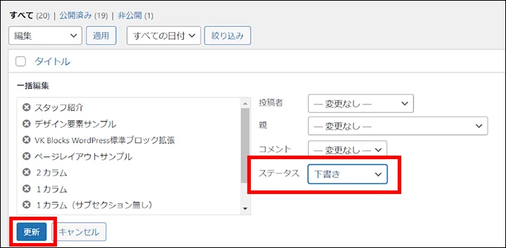 一括編集画面が表示されるので「ステータス」を「下書き」に変更し、更新をクリックします。