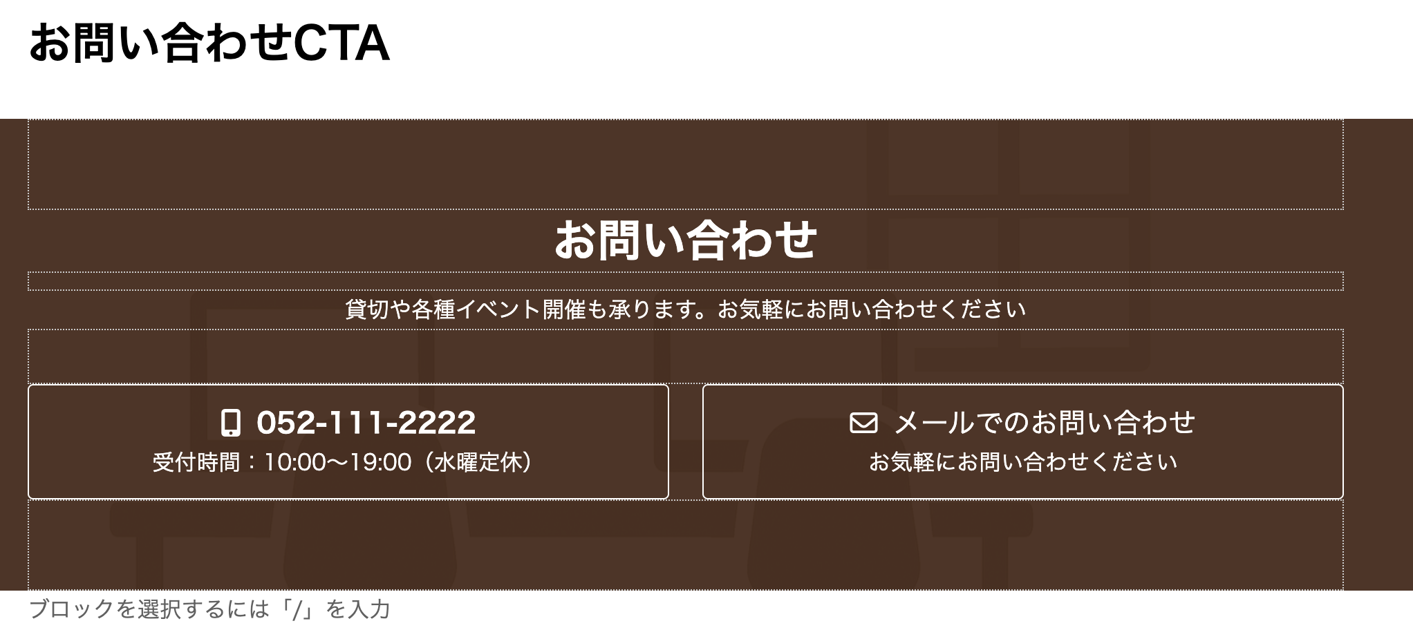 - 電話番号を【052-111-2222】に変更、「受付時間…」のテキストを下記に変更