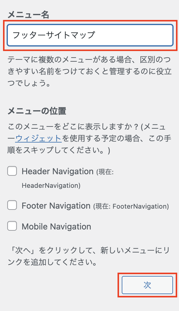 【メニュー名】に「フッターサイトマップ」を入力して【次へ】をクリック