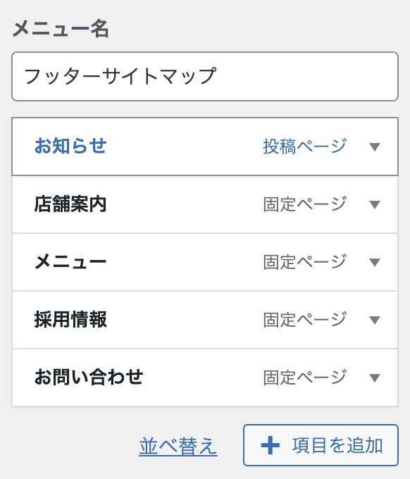 【メニューを選択】項目で「フッターサイトマップ」を選択します。