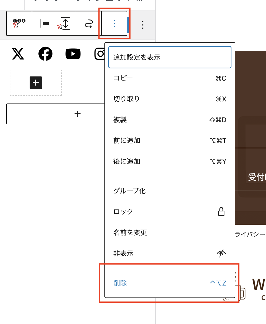 SNSアイコンパーツと置き換えるために、先に現在登録されているSNSアイコンパーツを削除します。