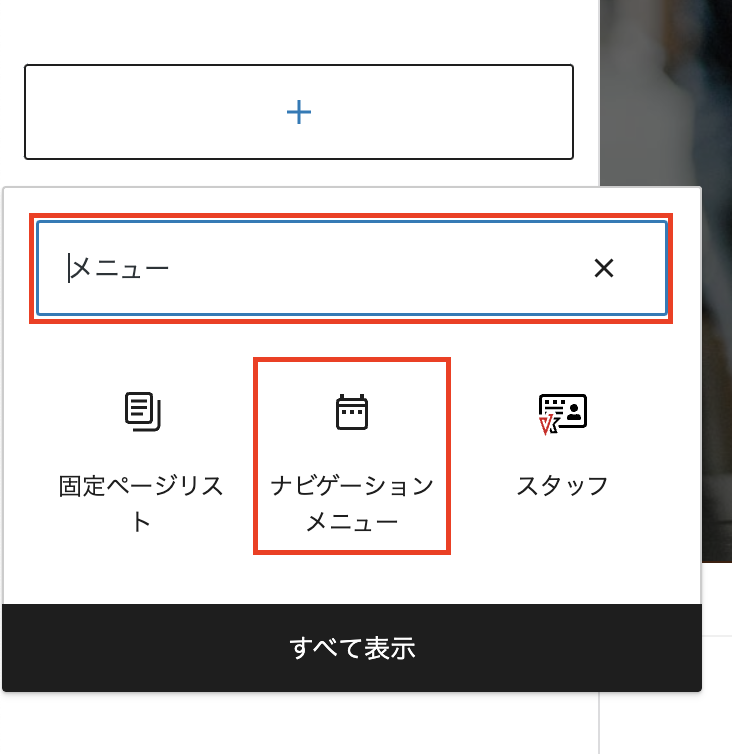 検索窓に「メニュー」を入力して【ナビゲーションメニュー】を選択します。