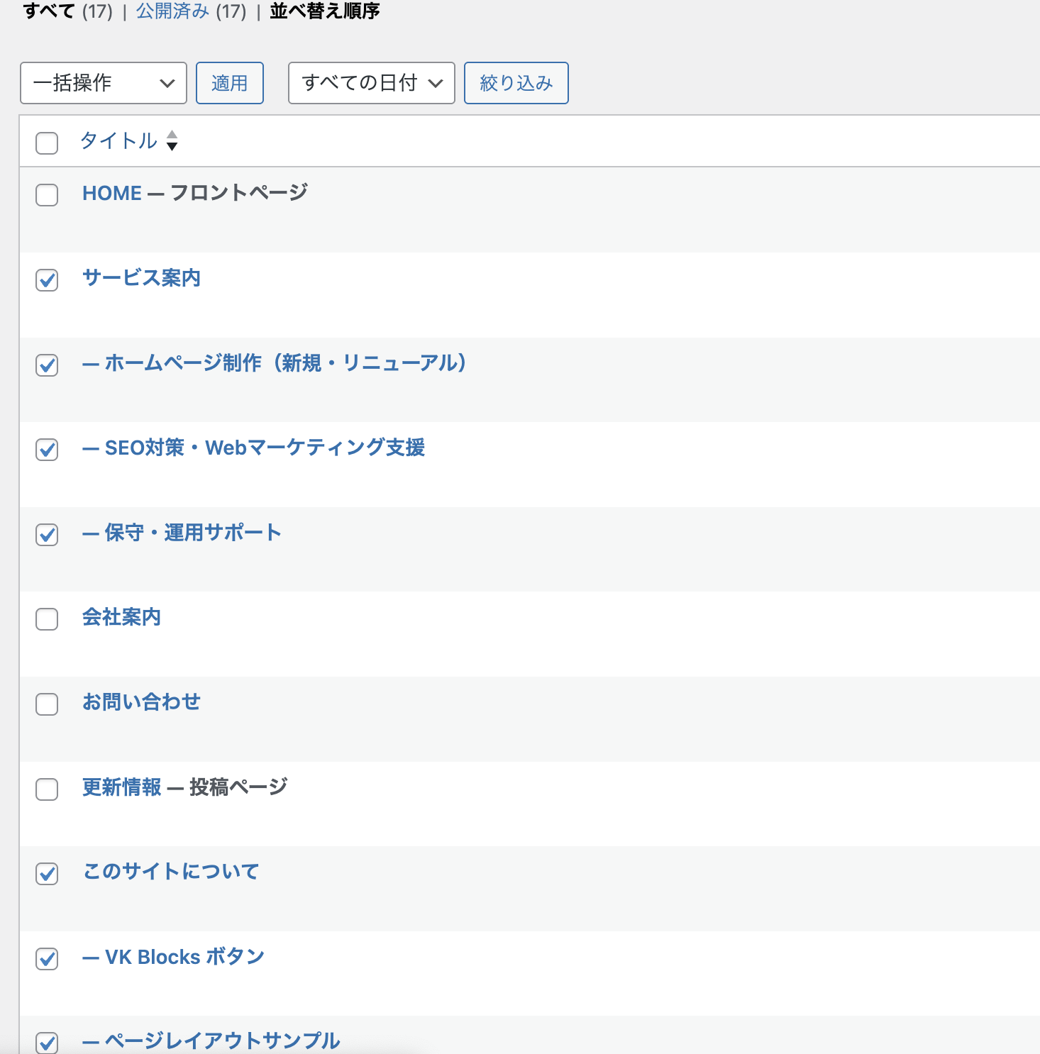 Lightningスターターセットであらかじめ登録されている固定ページが多数あり、今回作成するサイトには不要なページがあるためそれらは削除して逆に足りないものは追加します。