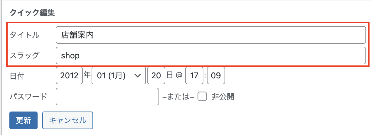 編集窓が表示されるので、タイトルとスラッグを指定のものに変更して【更新】をクリックして確定します。