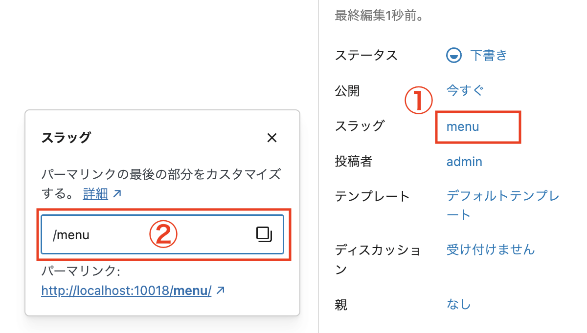 右側の固定ページメニューバーから【スラッグ】項目をクリックして、表示された入力窓にてパーマリンクを「menu」に設定します。