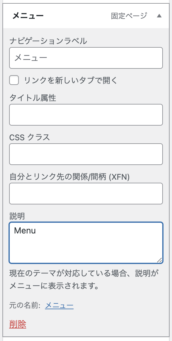 【メニュー】をクリックして、【説明】欄に「Menu」を入力します。